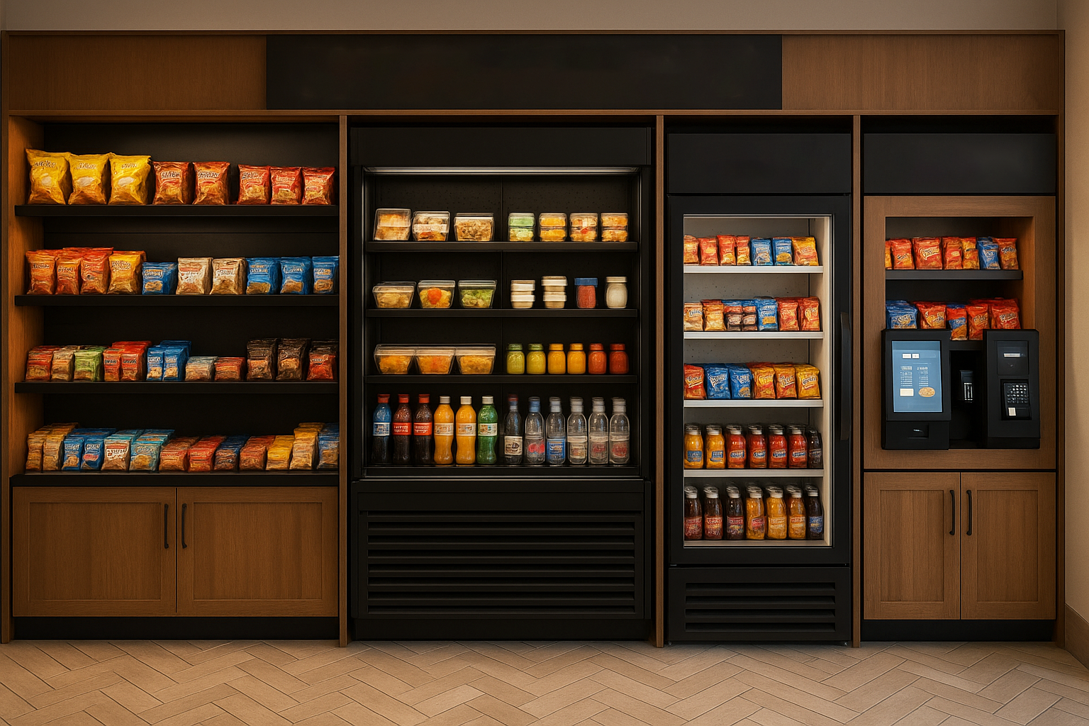 A micro-market is a self-service convenience store offering a wider variety of fresh foods, snacks, and beverages compared to traditional vending.