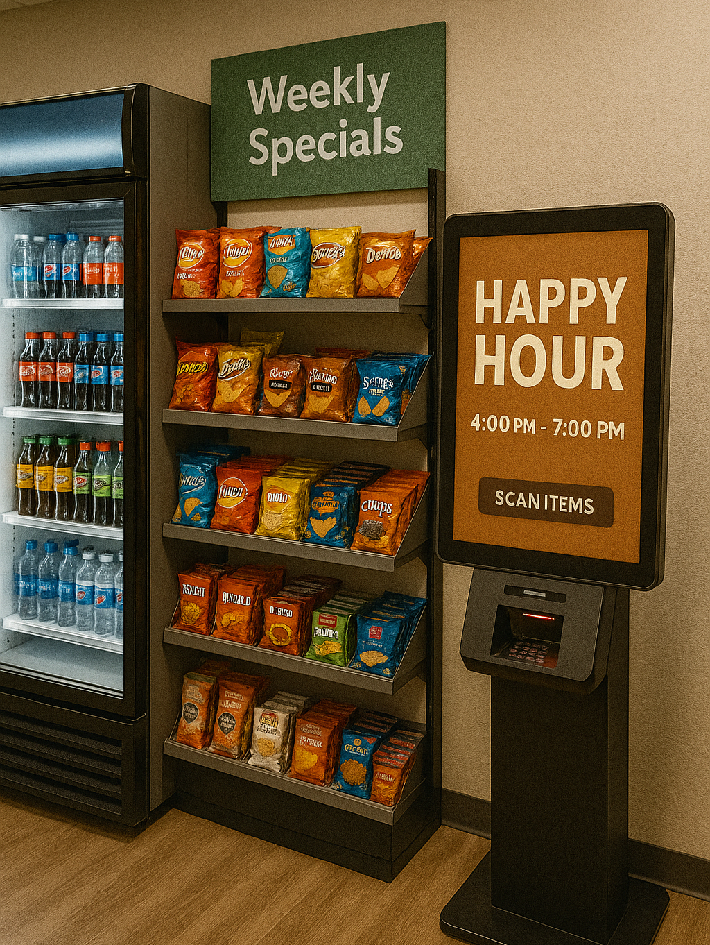 Our smart systems allow for flexible pricing updates, scheduled promotions, and special offers; all remotely managed. Run happy hours, weekend sales, or employee discounts effortlessly through your machines or micro-market kiosks.